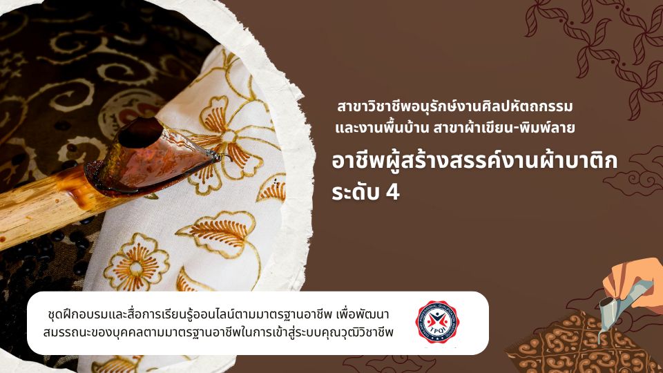 หลักสูตรฝึกอบรมตามมาตรฐานอาชีพ สาขาวิชาชีพอนุรักษ์งานศิลปหัตถกรรมและงานพื้นบ้าน สาขางานผ้าเขียน – พิมพ์ลาย อาชีพผู้สร้างสรรค์งานผ้าบาติก ระดับ 4